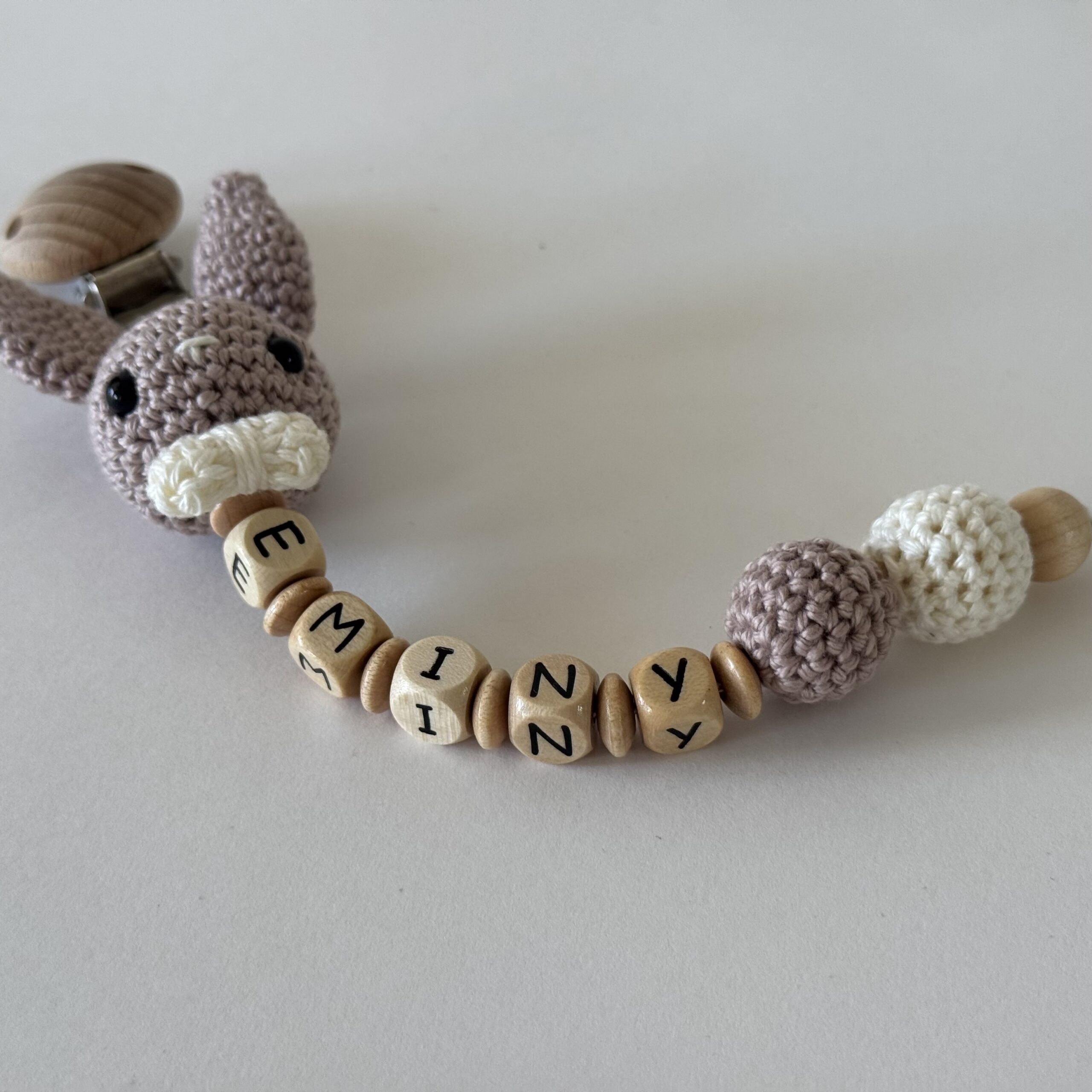 Unsere Schnullerketten halten den Schnuller stets griffbereit und verhindern, dass er verloren geht. Sie werden individuell mit Namen gestaltet und sind ein tolles Accessoire für dein Baby.