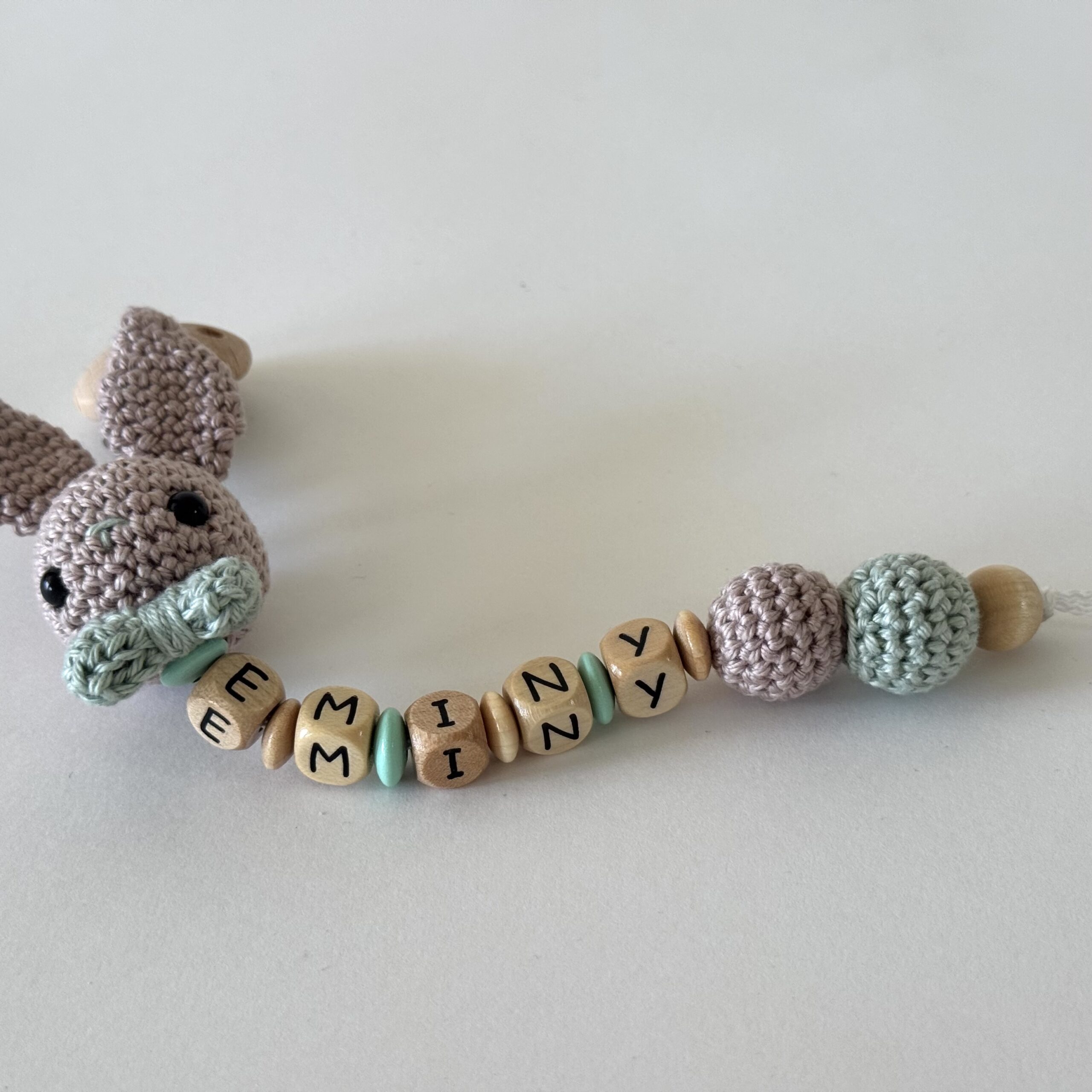 Unsere Schnullerketten halten den Schnuller stets griffbereit und verhindern, dass er verloren geht. Sie werden individuell mit Namen gestaltet und sind ein tolles Accessoire für dein Baby.