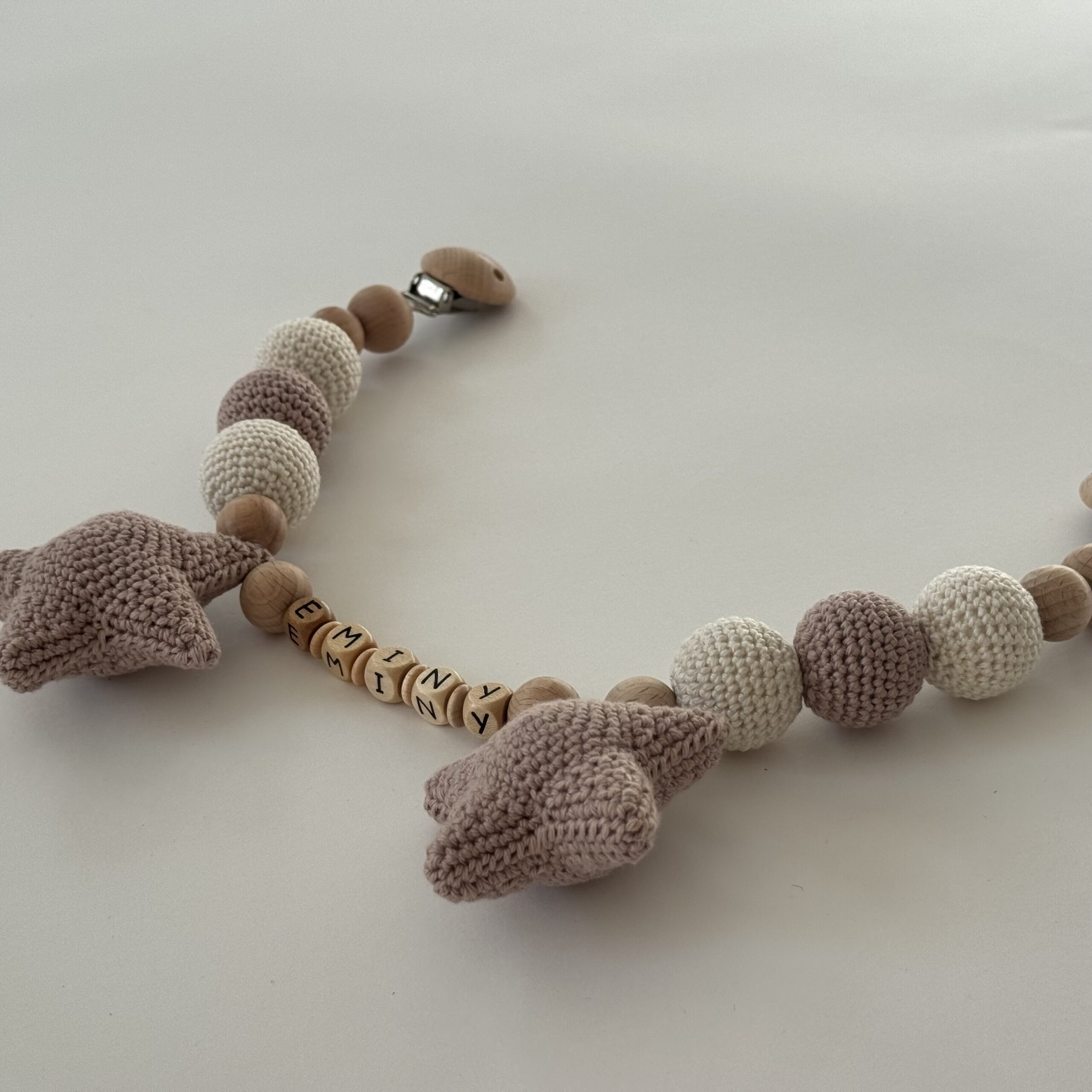 Unsere Kinderwagenketten sorgen für spannende Beschäftigung und fördern die Sinne deines Babys während der Spazierfahrten. Individuell gestaltet, sind sie ein echter Hingucker!
