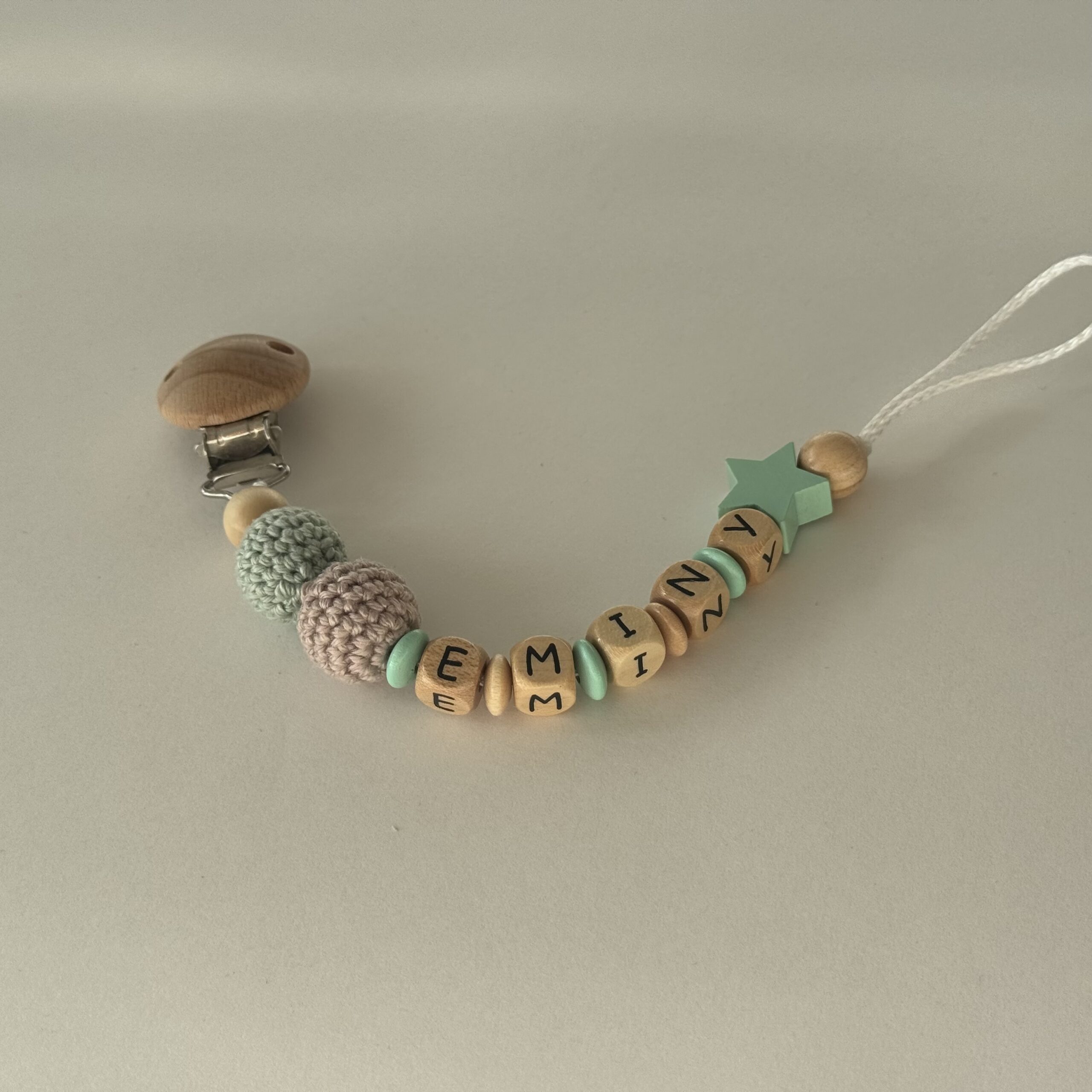 Unsere Schnullerketten halten den Schnuller stets griffbereit und verhindern, dass er verloren geht. Sie werden individuell mit Namen gestaltet und sind ein tolles Accessoire für dein Baby.